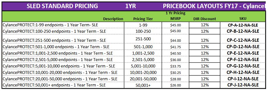 CylancePROTECT pricing:100-250 endpoints – 1 Year Term – SL